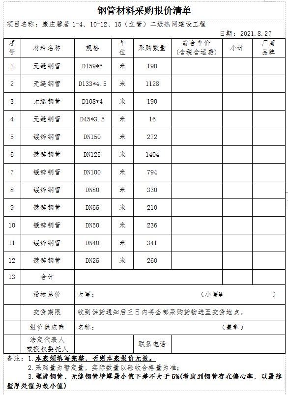1.材料采購內容:康莊馨居1-4、10-12、15(立管)二級熱網建設工程用鋼管,具體規(guī)格要求、數(shù)量詳見材料報價清單。
