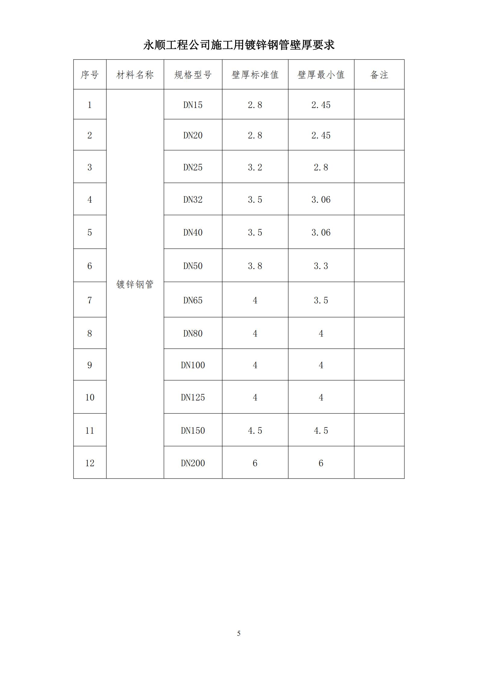 ②熱鍍鋅鋼管:標準為GB/T3091-2008 《低壓流體輸送用焊接鋼管》,管材不得彎曲、銹蝕,無飛刺、重皮及凹凸不平現(xiàn)象,外觀整齊、無銹斑、無變形;為熱浸鍍鋅,鍍鋅量不小于國家規(guī)范要求;鍍鋅鋼管壁厚不小于永順工程公司施工用鍍鋅鋼管最小壁厚,材料廠商品牌要求:徐州光環(huán)鋼管科技有限公司、天津友發(fā)鋼管集團股份有限公司、天津市飛龍制管有限公司、邯鄲市正大制管有限公司、天津君誠管道實業(yè)集團有限公司、河北天創(chuàng)管業(yè)有限公司、天津正金元鋼管有限公司;管體不應(yīng)標注“消防專用”等與熱力工程無關(guān)的字樣。