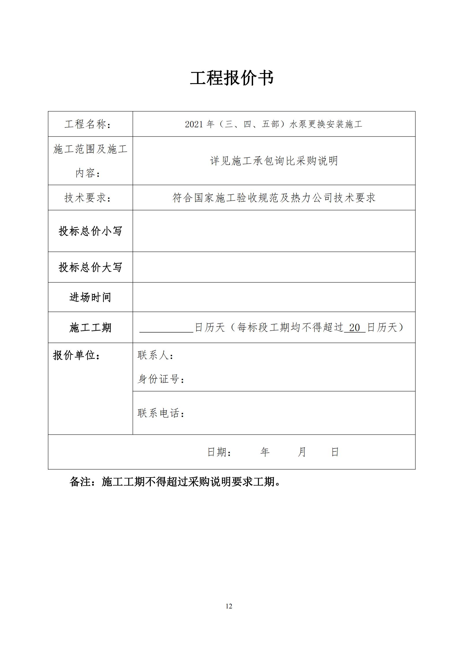 1.供應(yīng)商根據(jù)采購人提供的資料及自行勘查現(xiàn)場情況,規(guī)范并完整填寫《2021年(三、四、五部)水泵安裝施工工程量清單》、《工程報價書》、《技術(shù)工人清單》,填寫后放入信封中,信封密封并在密封處加蓋公章,在信封上書寫單位名稱。其中:《工程報價書》在單位名稱處蓋公章,《2021年(三、四、五部)水泵安裝施工工程量清單》、《技術(shù)工人清單》填寫完整后分別加蓋公章。未按要求提交投標(biāo)資料的取消參加資格。供應(yīng)商參加詢比采購會議時,將2021年(三、四、五部)水泵安裝施工工程量清單、報價書、技術(shù)工人清單交與采購人現(xiàn)場人員。