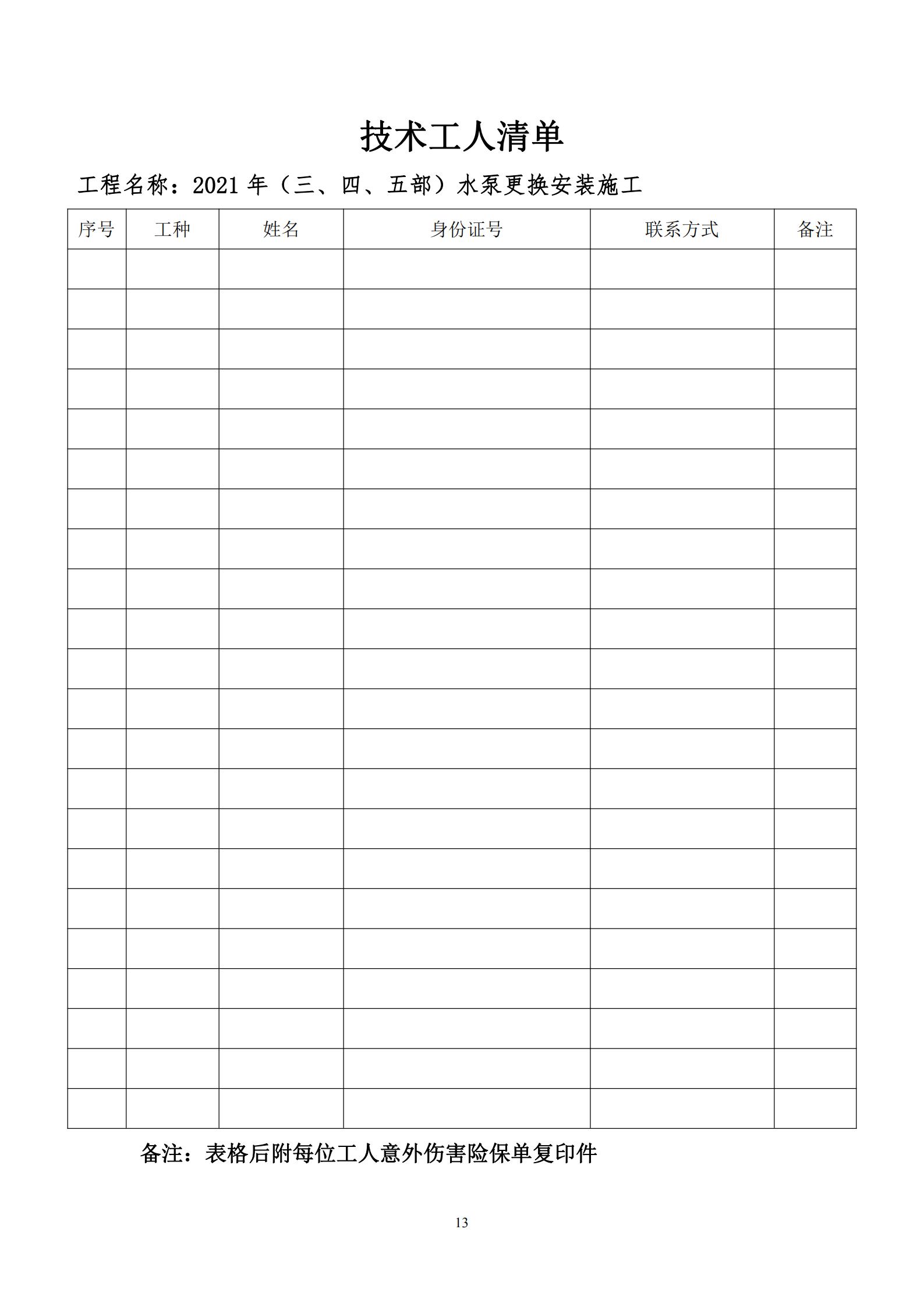 1.供應(yīng)商根據(jù)采購(gòu)人提供的資料及自行勘查現(xiàn)場(chǎng)情況,規(guī)范并完整填寫《2021年(三、四、五部)水泵安裝施工工程量清單》、《工程報(bào)價(jià)書》、《技術(shù)工人清單》,填寫后放入信封中,信封密封并在密封處加蓋公章,在信封上書寫單位名稱。其中:《工程報(bào)價(jià)書》在單位名稱處蓋公章,《2021年(三、四、五部)水泵安裝施工工程量清單》、《技術(shù)工人清單》填寫完整后分別加蓋公章。未按要求提交投標(biāo)資料的取消參加資格。供應(yīng)商參加詢比采購(gòu)會(huì)議時(shí),將2021年(三、四、五部)水泵安裝施工工程量清單、報(bào)價(jià)書、技術(shù)工人清單交與采購(gòu)人現(xiàn)場(chǎng)人員。