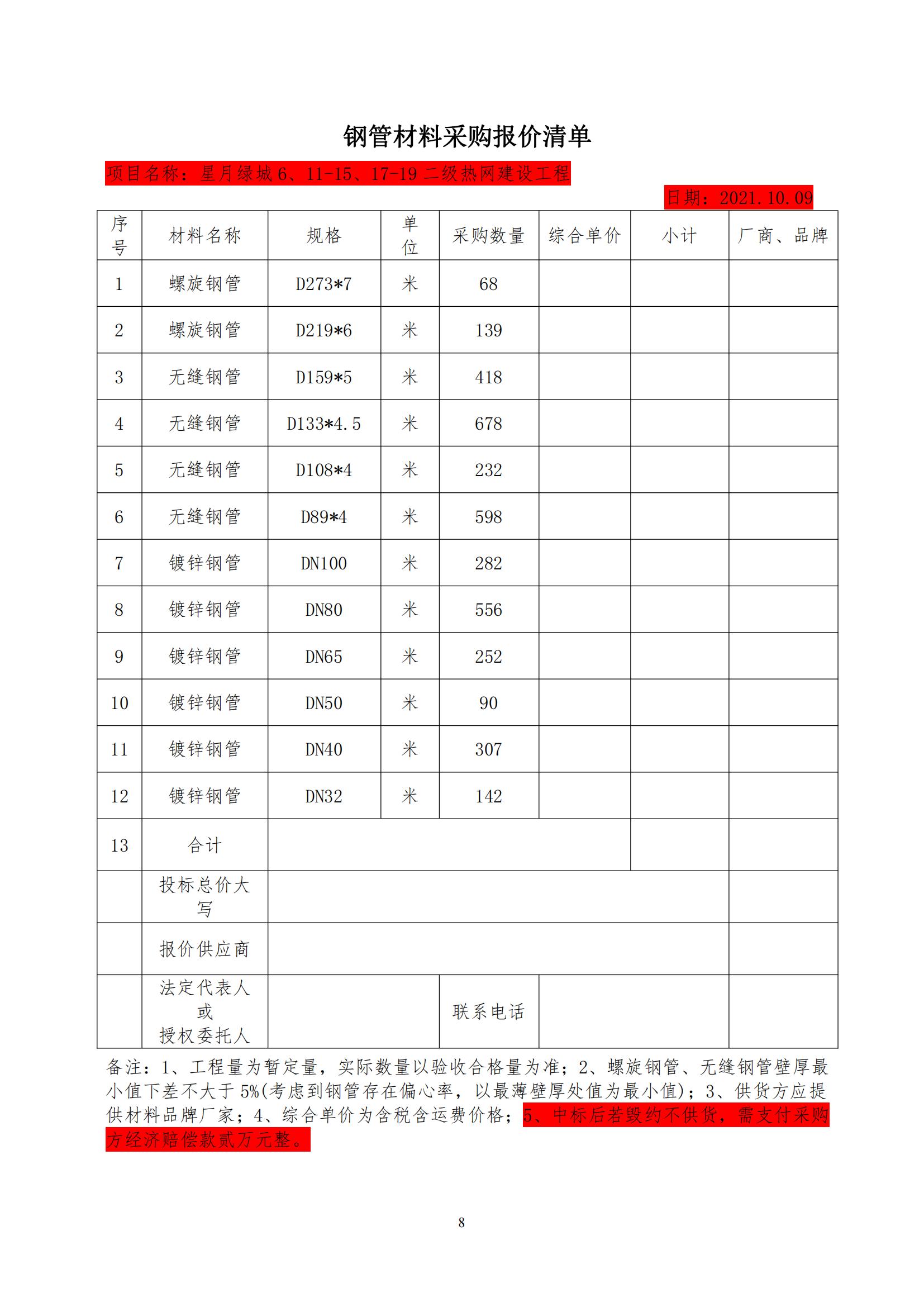 1.材料采購內(nèi)容:星月綠城6、11-15、17-19二級熱網(wǎng)建設工程用鋼管,具體規(guī)格要求、數(shù)量詳見材料報價清單。